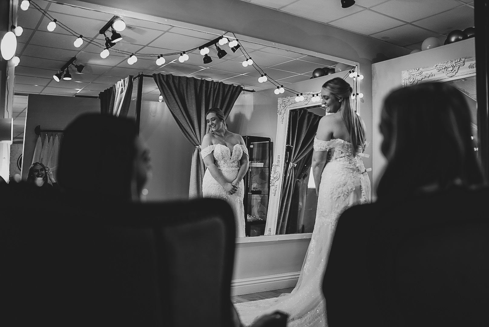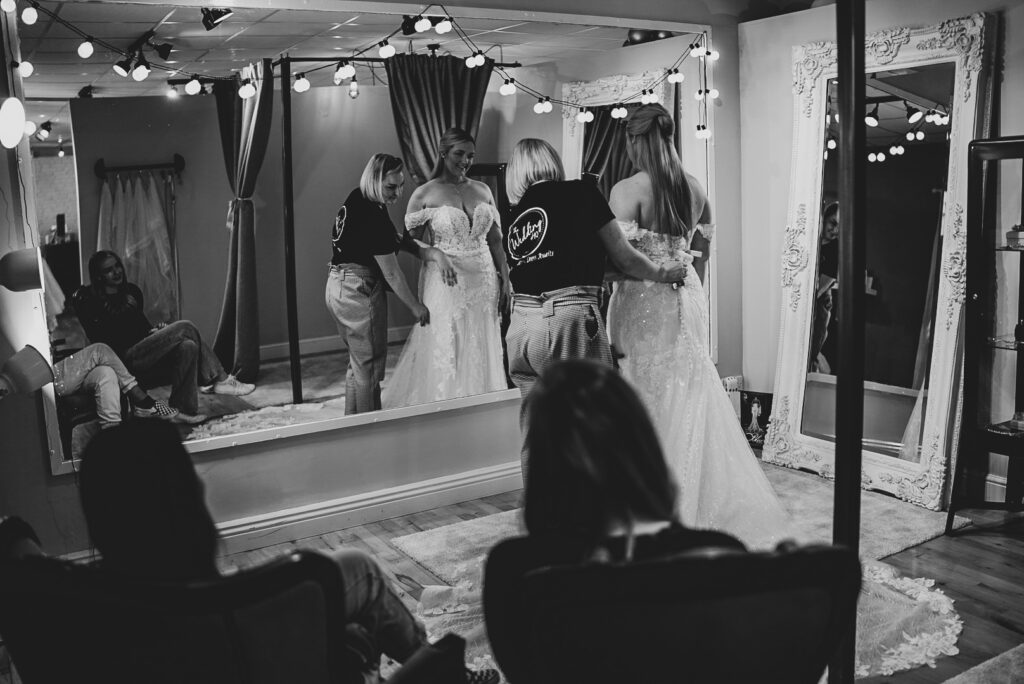 We have three separate bridal fitting areas with small seating areas. We recommend bringing 2-3 of those who really know you best. Remember ladies the more people you bring the more opinions will fly around. It can become overwhelming for the bride who brings large groups. We also recommend not to bring children.