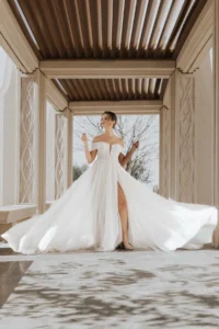 Our Sample is in a size 20. ROMANTIC TULLE A-LINE WEDDING DRESS WITH OFF-THE-SHOULDER STRAPS Float down the aisle in this luxurious tulle A-line wedding dress. Style D3843 features elegant off-the-shoulder straps that attaches to a plunging notched neckline bodice of gracefully gathered tulle and designer seam work. The modern patterned tulle gathers at the…