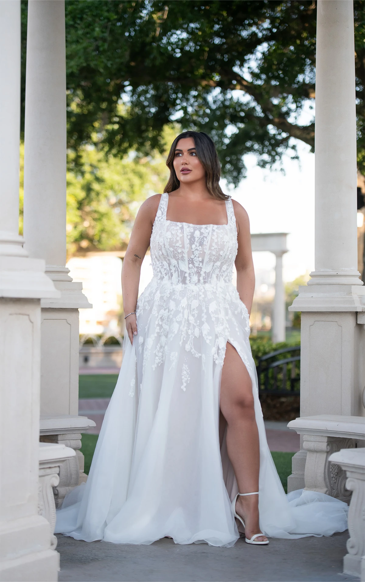 Get swept away in the fairy tale romance of Style D4030, a romantic A-line plus size wedding dress of elegant lace, tulle, royal organza and 3D floral lace appliqués. From embellished shoulder straps, a classic square neckline introduces a sheer corset bodice with pearl button closures in the back. From the waist, the timeless A-line silhouette softly skims the figure, opening at the thigh for an alluring leg slit as delicate lace appliqués scatter across flowy layers of tulle. With its blend of classic elegance and contemporary edge, this plus size square neck wedding dress promises an entrance as alluring as it is ethereal for the bride who dreams of infusing romantic wonder into their special day.