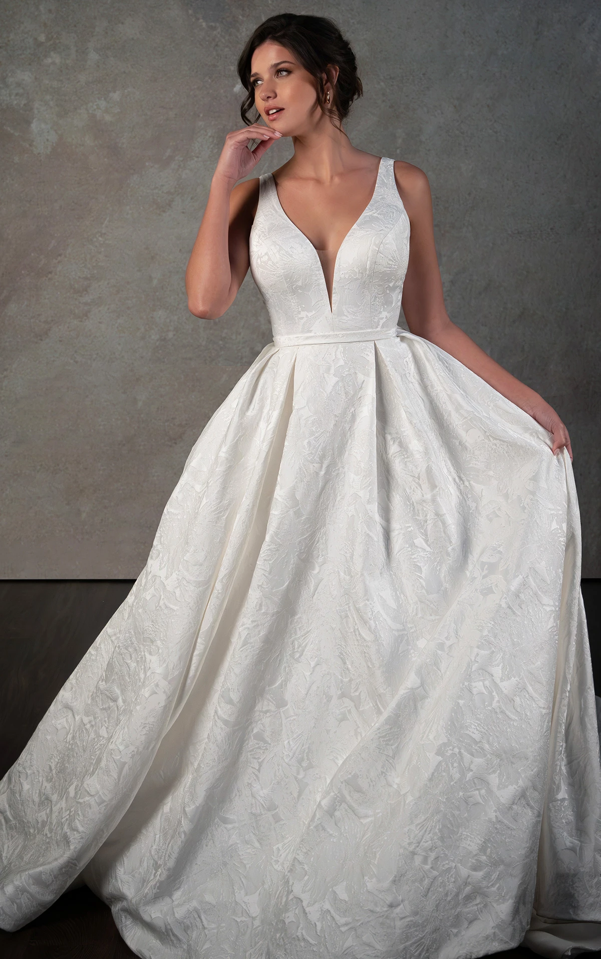A modern bride’s dream comes to life in Style D4140, a stunning textured satin wedding dress that eschews traditional lace for contemporary elegance. The A-line silhouette begins with a daring deep V-neckline, plunging from sleek shoulder straps to create a sculpted, contoured bodice. Lined with illusion tulle for modesty and comfort, this sexy A-line wedding gown balances allure with sleek sophistication. A matching V-back detail mirrors the front, while a subtle waistband marks the transition to a full, pleated skirt where the luxurious textured satin truly shines. Discreet side pockets add a practical touch to this sleek bridal look, available in timeless ivory or showstopping gold for the fashion-forward bride. This gown is also available in plus sizes.