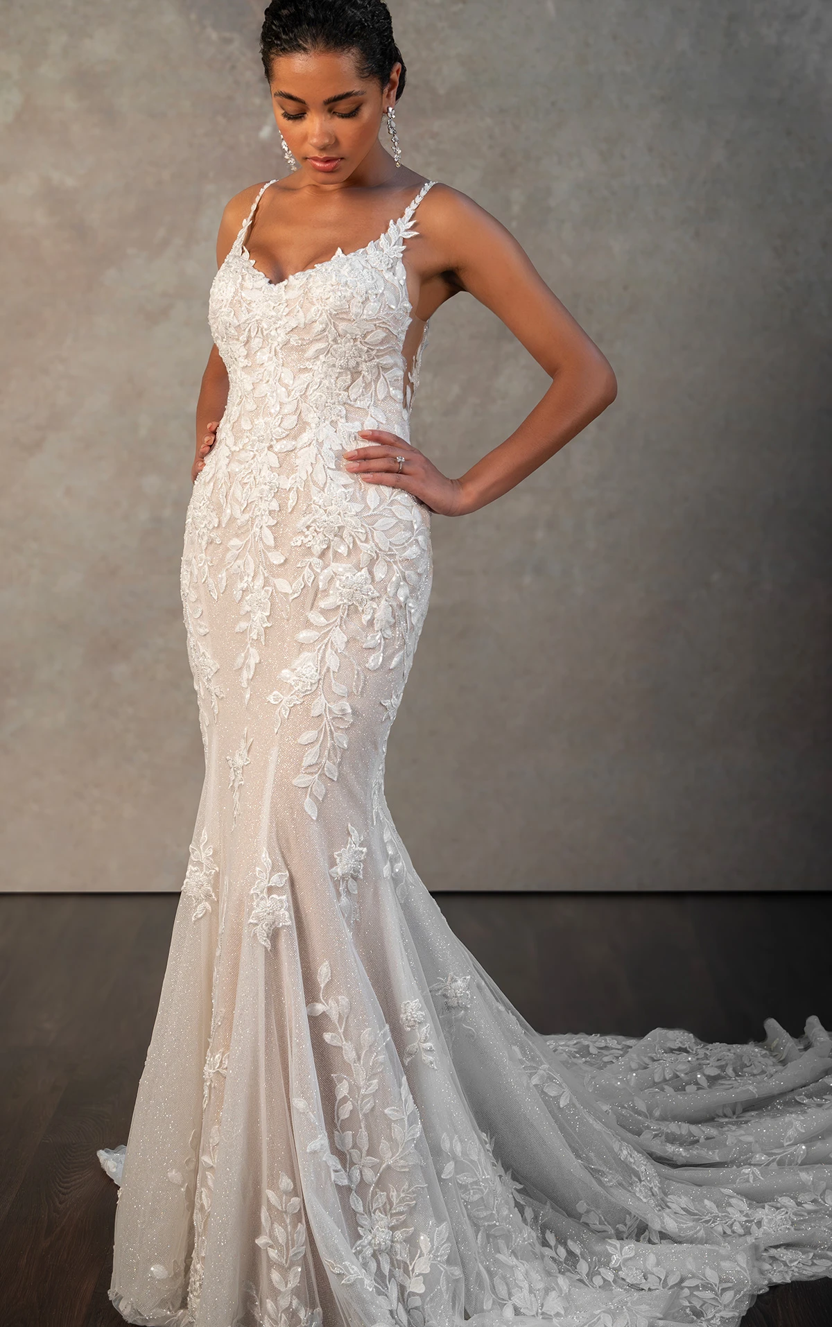 Timeless romance meets modern sensuality in this sexy lace fit-and-flare wedding dress. Delicate lace spaghetti straps introduce this dazzling gown, meeting a soft V-neckline that frames a sheer lace bodice. Style D4223 features a super low open back detail outlined in stunning floral lace, adding an organic allure to this flattering gown. The allover lace look shimmers down the aisle with glittering lace accents, becoming more subtle past the hip before outlining a vintage-inspired lace shaped train. This spaghetti strap wedding gown offers a mesmerizing blend of classic elegance and modern allure for the bride seeking a show-stopping wedding day look.