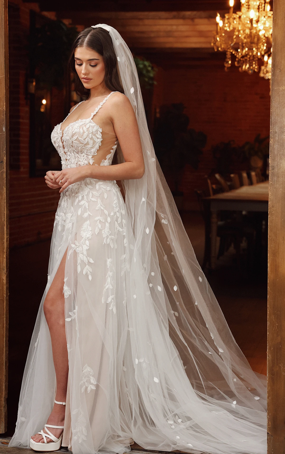 Ethereal romance comes to life in Style D4258, a dreamy lace wedding dress with a hint of bohemian charm. Delicate lace spaghetti straps frame a plunging sweetheart neckline, leading to a sheer lace bodice adorned with intricate 3D floral appliques. Peeking through the design, sexy corset boning adds a touch of allure and structure. From the classic Basque waist, layers of frothy tulle cascade into a soft A-line silhouette, accented by a tasteful leg slit for a modern edge. Blending whimsical romance with contemporary boho elements, this enchanting wedding gown is the perfect balance of timeless beauty and effortless style.