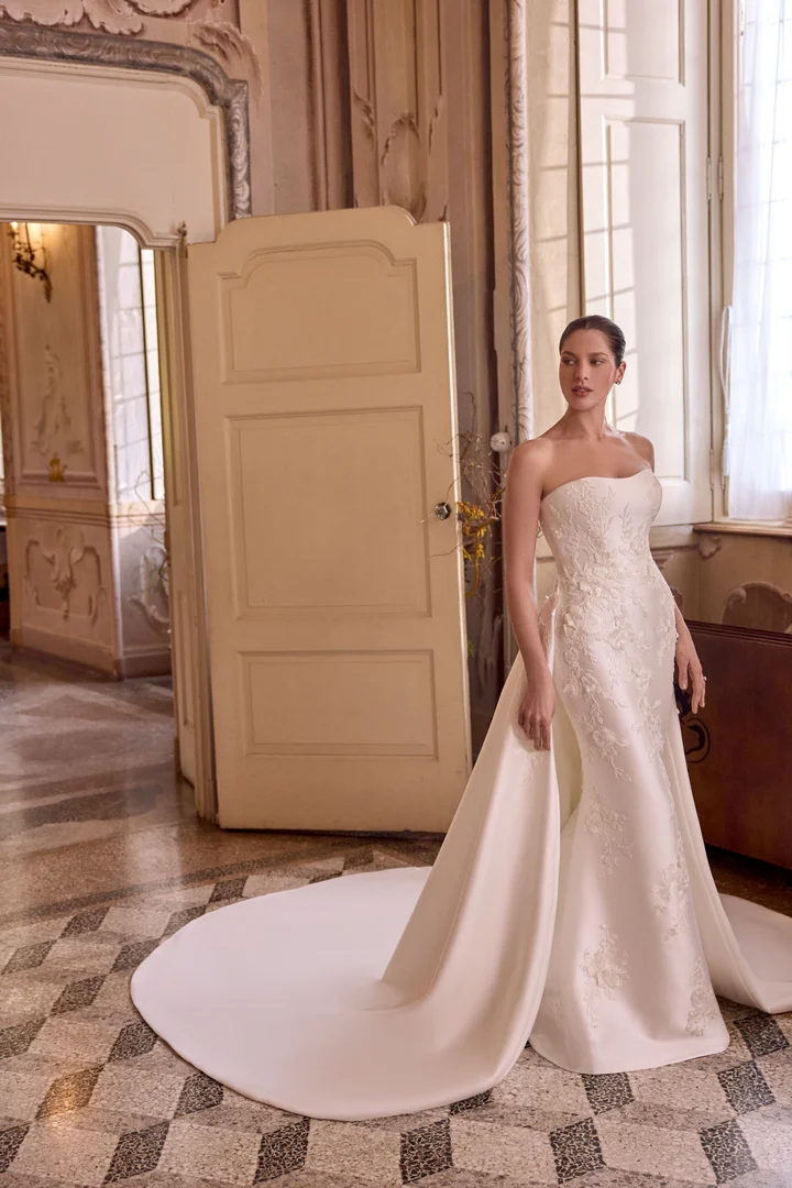 Mikado Fit and Flare Gown with Matte Lace Appliqués and 3D Flowers[caption id="attachment_7925" align="alignnone" width="200"] Mikado Fit and Flare Gown with Matte Lace Appliqués and 3D Flowers[/caption]