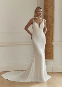 MERIDA Stunningly beaded bodice with a crepe fishtail skirt and sophisticated seam details. Shown in ivory/light rumpink.